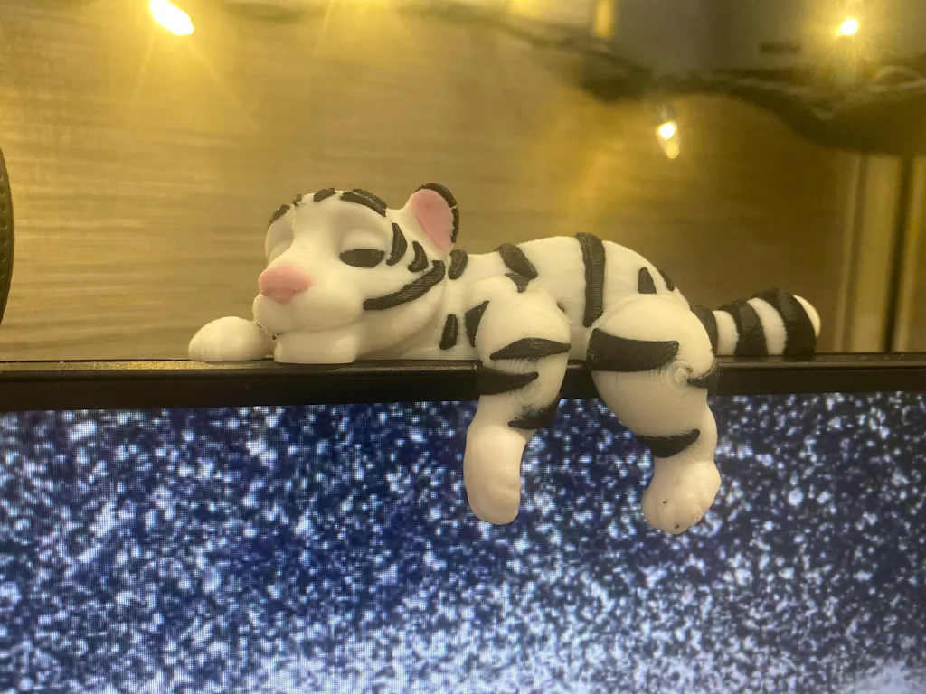 Add a touch of whimsy to your space with this adorable 3D printed sleeping tiger shelf sitter! This cozy little tiger is designed to rest with its legs and tail draped gently over the edge of a shelf or monitor, creating a charming and relaxing vibe wherever it’s placed.